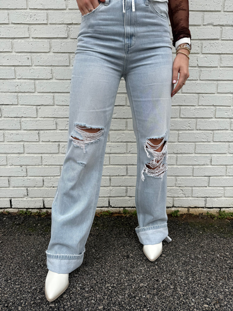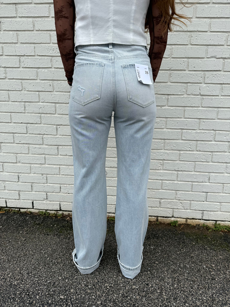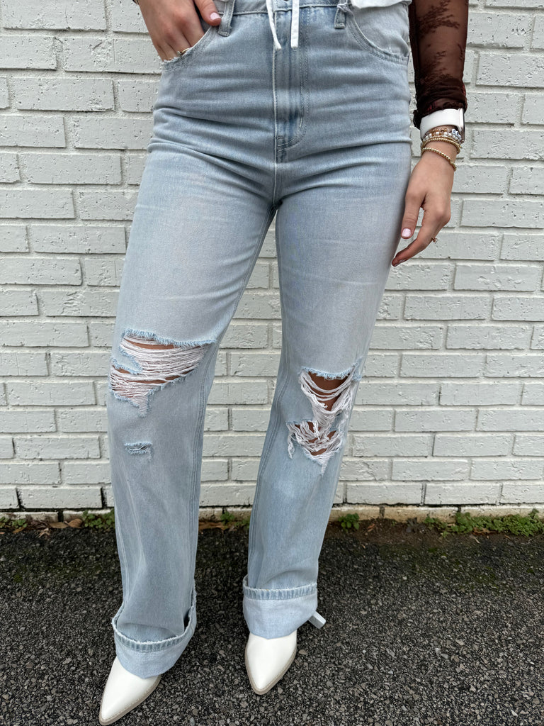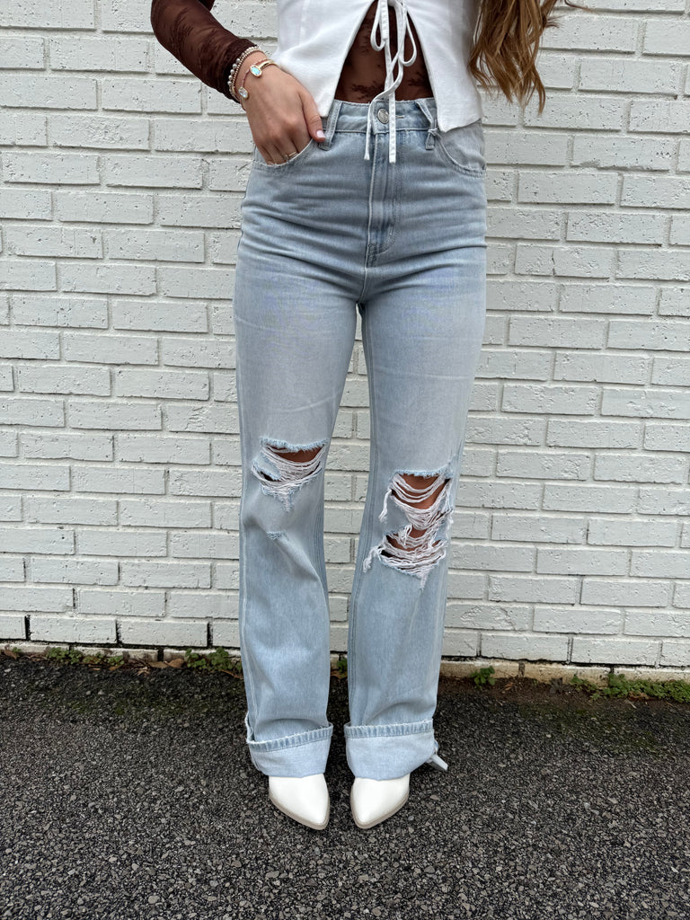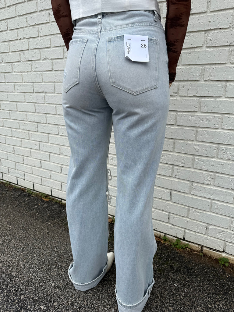 She rolled the bottom of the jeans up, or you can wear them straight down for more length. 100% Cotton