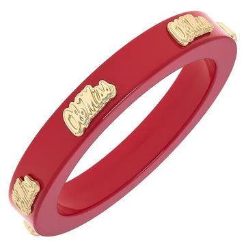 Make the perfect game-day fashion statement with the Ole Miss Rebels Resin Bangle! This stylish bangle is made of resin with worn gold logo charms attached. Its bold color makes it the perfect tailgate accessory.