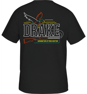 The Drake Short Sleeve Graphic Tee is constructed from a 60% cotton and 40% polyester blend, providing softness and comfort. The Drake Shoot See has a Drake logo on the front pocket and depicts a Neon Sign from our Drake Logo Series of back graphic tees.
